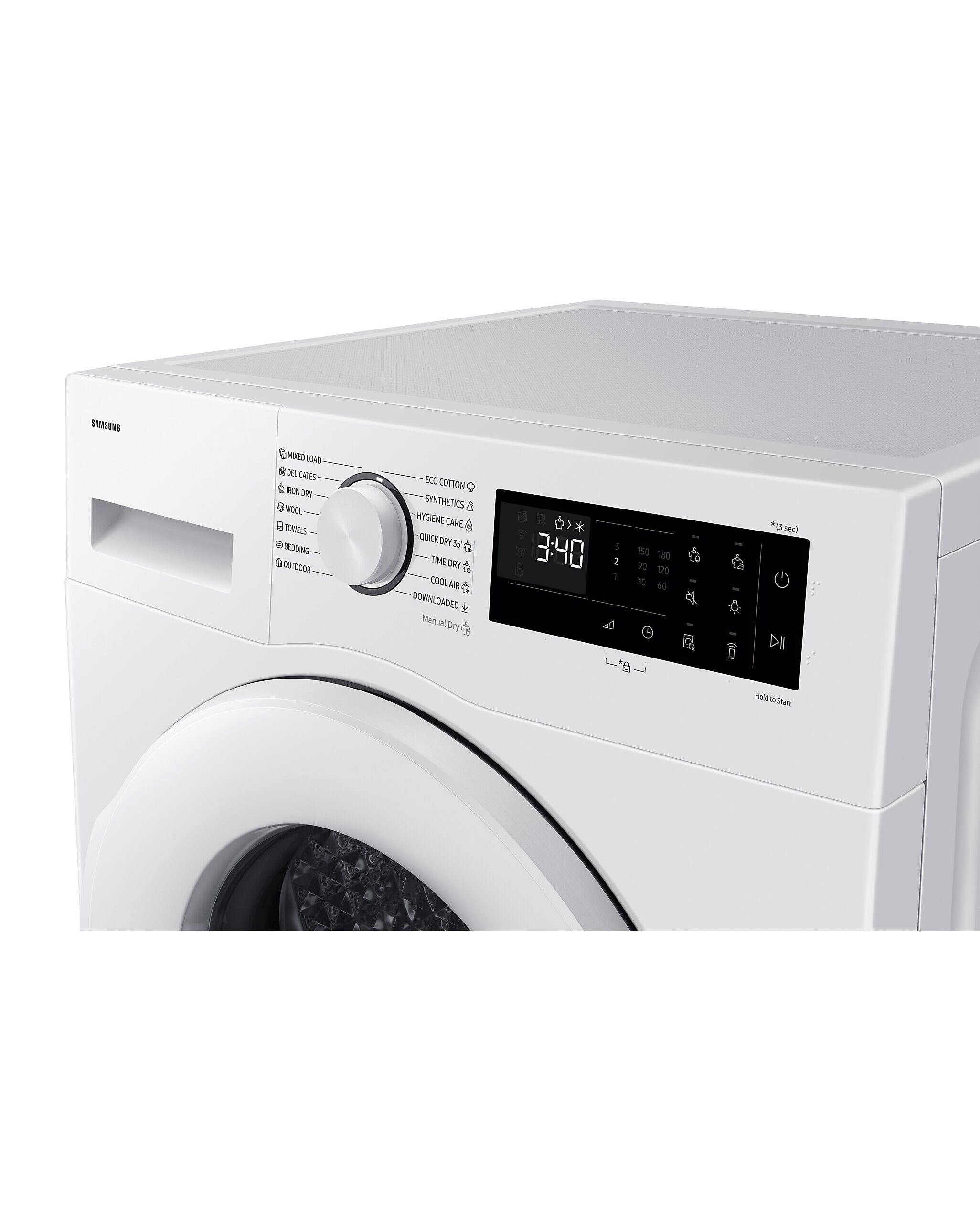 Iespēju saraksts Pretburzīšanās, sausuma līmenis, žāvēšanas laiks, mitruma brīdinājums, cilindra apgaismojums, bērnu slēdzene, izslēgšana