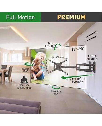 Leidžia pasukti 90 laipsnių kampu televizoriams iki 77"/ 195,6 cm (plotis iki 68"/ 172 cm) ir 70 laipsnių kampu televizoriams iki 90"/ 228,5 cm.