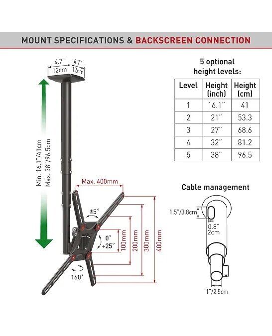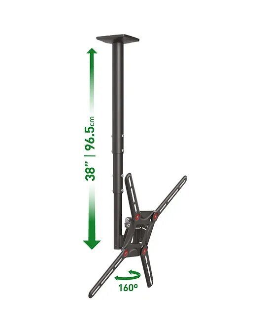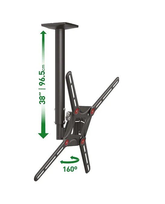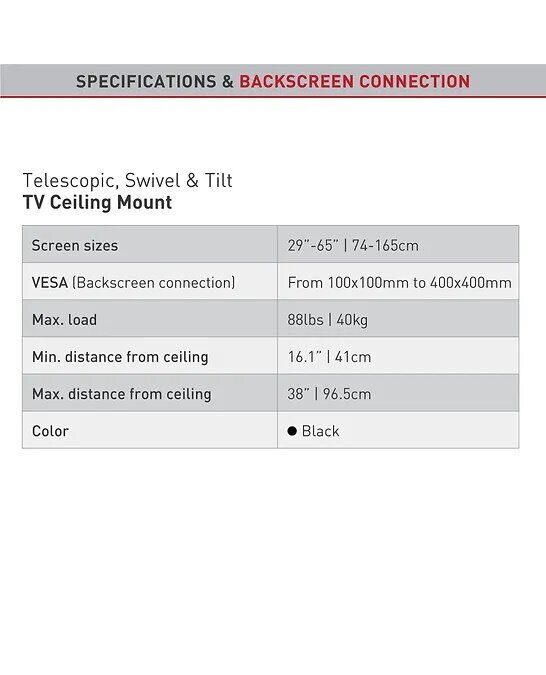 Lubinis (juodas), Flat & Curved TV ekranams 40 kg. Teleskopinis mechanizmas. VESA iki 400X400mm (VESA & Non VESA). Atstumas nuo lubų: min 54cm / max 89cm |